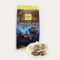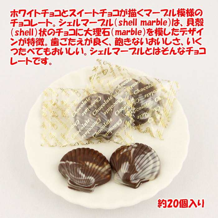 ホワイトチョコとスイートチョコが描くマーブル模様のチョコレート。シェルマーブル(shell marble)は、貝殻(shell)状のチョコに大理石(marble)を模したデザイン。貝の形状を模して若干歪曲しているの食感が心地よいのが特徴。中まで二種類のチョコが混ざり合っており、ホワイトチョコとスイートチョコのハーモニーが楽しめます。飽きないおいしさ、いくつたべてもおいしい。シェルマーブルとはそんなチョコレートです。